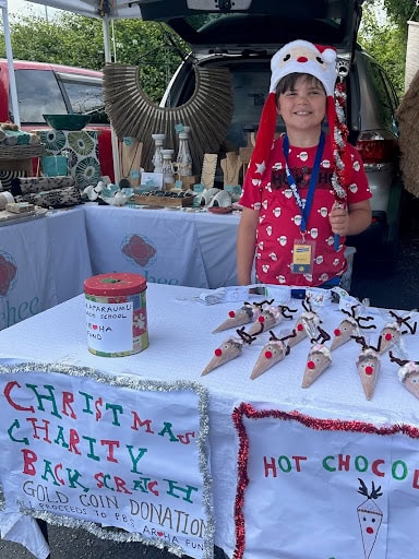 Over the weekend, PBS student Mitchell set up a stall at the Ōtaki Kids Market, selling festive goodies and offering back scratches with his very own “festive scratching stick” — all for a gold coin donation!
