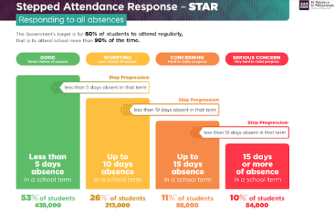 The Ministry of Education has introduced the “Stepped Attendance Response (STAR)” process for schools to follow when managing student attendance. As you can see in the chart below, the Government has set a target for 80% of students attending school regularly. Regular attendance is regarded as 90% of the time.